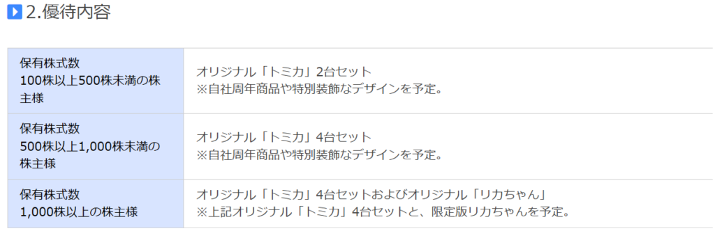 保有株数が500株以上に増えるとトミカ4台セット、1000株以上になるとオリジナル「リカちゃん」がもらえます。