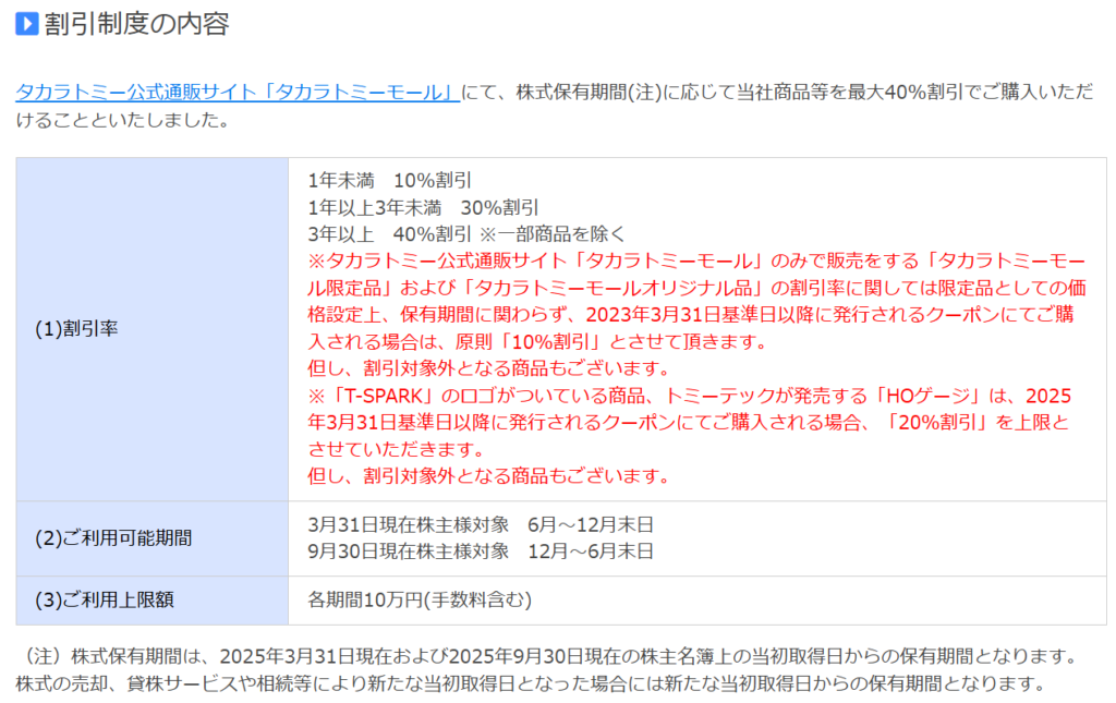 2025年3月期株主優待制度の内容を一部引用してご紹介しますが、最新の情報は株式会社タカラトミーHPをご確認ください。