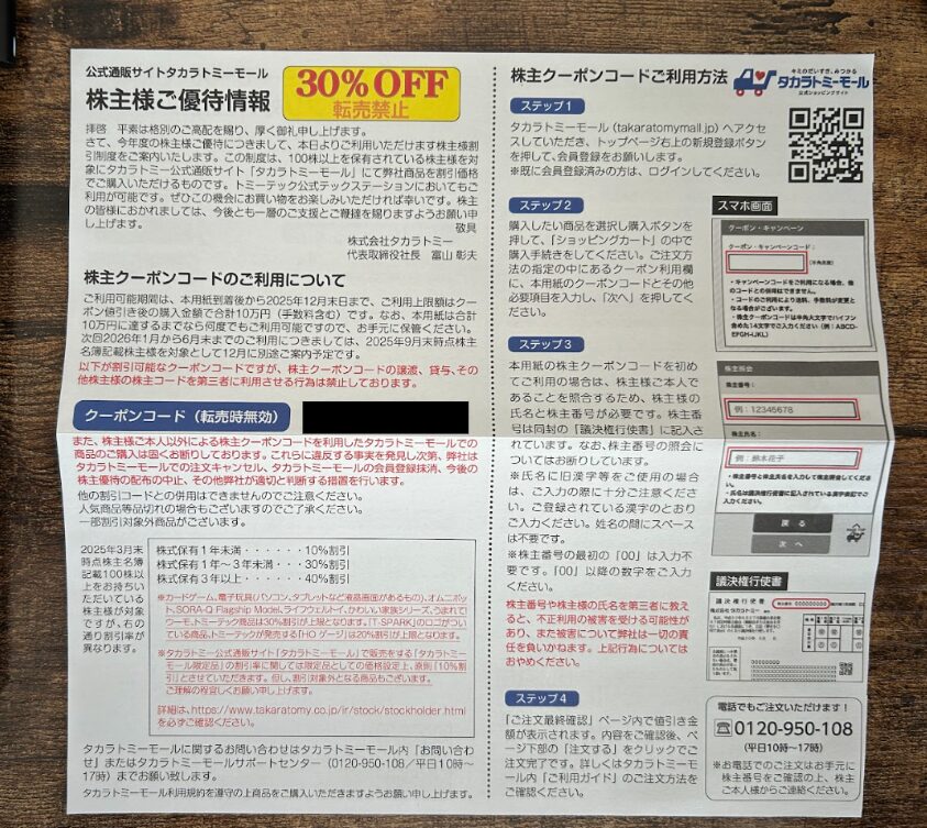 こちらは少し前に届いたタカラトミーモールで利用できるクーポンです。