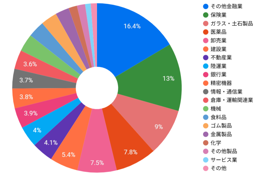 評価額で最も割合が大きいのが「その他金融業」で16.4%ですので、大きな偏りはなく十分分散できているかと思います。