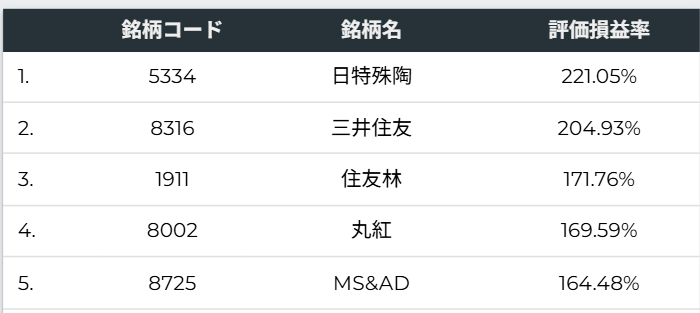 評価損益率の銘柄ランキング(TOP5)