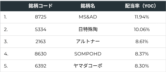 最後に、YOCの高い順上位5銘柄をご紹介します。